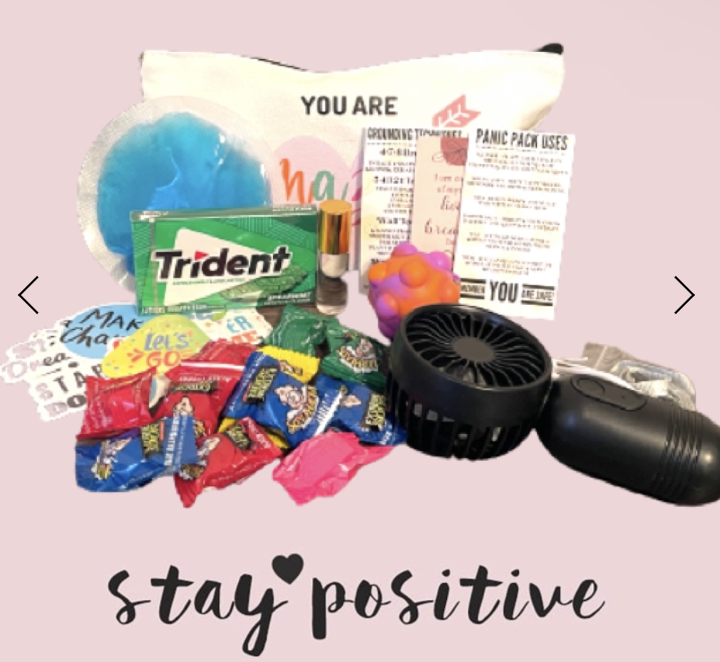 Each pack comes with instructions on how to use each item. They include a reusable ice pack, sour candy, choice of ylang ylang or lavender essential oil, popper ball, rechargeable fan, pack of gum, and a stylish zipper pouch. There are also grounding techniques and stickers included.