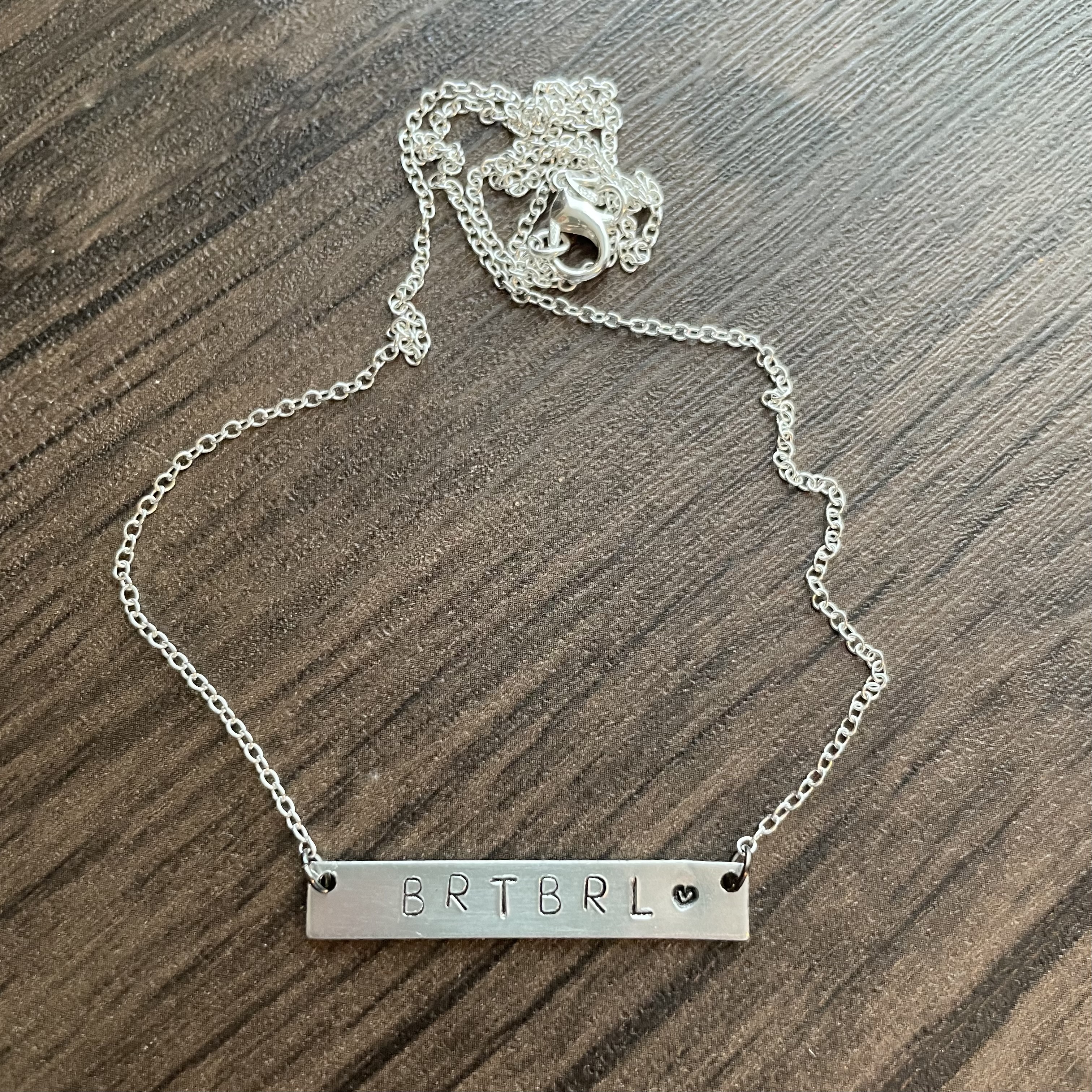 These bar style necklaces can fit up to 7 letters and a heart. They are made of aluminum and the chain length is 18inches.